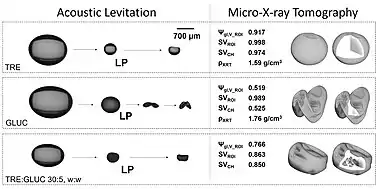 (Left) Images of acoustically levitated droplets during liquid evaporation and particle formation. (Right) X-ray microtomography gives insights into the final particle 3D structure.[58]