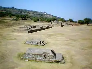 The Great Platform (between the circular temple and the Palace), the structure has rooms, patios and altars; some red stucco finishing remains to date; also, two small altars were found near the foundation of the main temple and in front in the lower part.