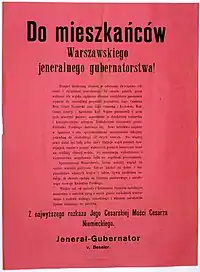 The Act of 5th November of 1916 was a declaration of Emperors Wilhelm II of Germany and Franz Joseph of Austria. This act promised the creation of the Kingdom of Poland out of territory of Congress Poland, envisioned by its authors as a puppet state controlled by the Central Powers. The origin of that document was the dire need to draft new recruits from German-occupied Poland for the war with Russia. Even though the act itself expressed very little in concrete terms, its declaration is regarded as one of main factors in the Polish efforts to regain independence. Despite official statements, the German Empire really planned to annex up to 30,000 km² of prewar Congress Poland, with expulsion of between 2 and 3 million Poles and Jews out of these territories to make room for German settlers.[1][2][3][4][5][6]
