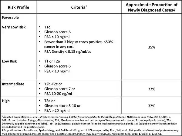 The Prostate Cancer Intervention versus Observation Trial (PIVOT) randomized 731 men diagnosed with localized prostate cancer to radical prostatectomy or observation (mean age 67 years; median PSA 7.8 ng/ml).[10] In the observation group, bone metastases and prostate cancer death occurred in 10.6% and 8.4%, respectively through 12 years.[10] Death from prostate cancer occurred in 5.7% and 17.4% of men diagnosed with Gleason score below 7 and 7 and above, respectively; and 6.2% and 12.8% of men with a PSA of 10 ng/ml or below and above 10 ng/ml, respectively.[10] Stratified by D’Amico risk groups (see Prostate Cancer Risk Stratification Table[11][12][13][14][15] at right for explanation), death from prostate cancer occurred in 2.7%, 10.8%, and 17.5% of men with low, intermediate, and high risk disease, respectively.[11] Recognizing that men in the PIVOT study were more likely to have been diagnosed as a result of PSA based testing as compared to men in the SPGS-4 who were not, it is of interest that cumulative deaths from prostate cancer in the SPGS-4 among men with low risk disease (11%) is comparable to that of men with intermediate risk disease (10.8%) in PIVOT. These data suggest that the outcomes for men with low risk disease in the pre PSA era are comparable with those of men today diagnosed with intermediate risk disease.