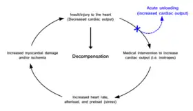 Cardiac traumas such as myocardial infarction (commonly called a heart attack), myocarditis, peripartum cardiomyopathy, cardiogenic shock , and takotsubo cardiomyopathy result in an impaired ability of the heart to pump blood. Without proper blood flow the person will ultimately die. Maintaining sufficient cardiac output is the primary objective of therapeutic approaches treating these cardiac conditions. However, many therapies aimed at increasing cardiac output place further stress on the heart. In this way a well-document vicious cycle begins in which increased cardiac output is required, but in order to achieve this the heart must work harder. This exacerbated stress leads to poorer outcomes.[1] With the exception of cardiopulmonary bypass, current therapeutic approaches do not allow the heart to rest and recover. The workload of the heart (pumping blood) is never uncoupled from heart function. Acute cardiac unloading is able to functionally uncouple[2] the heart from cardiac output, allowing the heart to rest and recover from damage.
