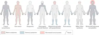 A number of subtypes of Guillain–Barré syndrome are recognized.[5][39] Despite this, many people have overlapping symptoms that can make the classification difficult in individual cases.[6][40] All types have partial forms. For instance, some people experience only isolated eye-movement or coordination problems; these are thought to be a subtype of Miller Fisher syndrome and have similar antiganglioside antibody patterns.[11][40]