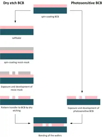 Benzocyclobutene (BCB) is a hydrocarbon that is widely used in electronics.[16] BCB exists in a dry etch and a photosensitive version, each requiring different procedural steps for structuring (compare BCB process flow).[17]