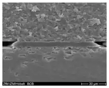 It does release only small amounts of by-products during curing which enables a void-free bond. This polymer ensures very strong bonds and excellent chemical resistance to numerous acids, alkalines and solvents. The BCB is over 90% transparent to visible light that enables the use for optical MEMS applications.[16]