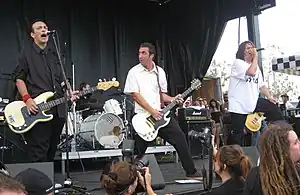 The Adolescents performing in 2007. Left to right: Bassist Steve Soto, drummer Derek O'Brien, guitarist Matt Beld, and singer Tony Reflex.