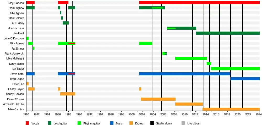 O'Donovan and Williams both left the band in June 1980.[2] Soto later recalled "John was more concerned with acting like Johnny Thunders instead of playing like him, and Pan refused to shave his sorry excuse of a teenage mustache. I think Pan's girlfriend was supposed to pay for our first demo and then pleaded broke when it came time to pay the man".[2] Rikk Agnew joined the band, initially as drummer: "Rikk started as our drummer and let me tell you, as a drummer Rikk was second only to Keith Moon", said Brandenburg; "He didn't have much of a drum kit...we had to borrow stuff at gigs, and Rikk kept breaking stuff that belonged to other people (he had this bad habit of kicking the drum kit over). For the sake of survival in an environment of increasingly hostile peer-bands, Rikk switched over to guitar, and Rikk's ex-Detours bandmate 'Uncle' Casey Royer joined on drums".[5][8] Rikk and Royer brought with them several songs written for the Detours, including "Amoeba", "No Way", "Creatures", "Rip It Up", and "Kids of the Black Hole".[2][5][10] "With the addition of Rikk and Casey, we'd moved to the next level", recalled Frank Agnew, "They were older and more experienced, so we improved quickly".[2]
