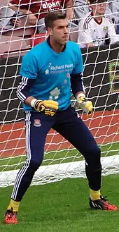 On 11 January 2014, Adrián kept his first Premier League clean sheet, in the 2–0 away win over Cardiff City.[21] On 6 May, he attended the club's awards and won "Save of the Season" for a fingertip save from Oscar against Chelsea in January. He also won "Best Individual Performance" for the same match, in which he kept a clean sheet in a goalless draw, as well as "Signing of the Season". He was also named runner-up "Hammer of the Year" to Mark Noble.[22] By the end of the 2013–14 season, he had become West Ham's first-choice goalkeeper, replacing previous incumbent Jussi Jääskeläinen.[23] In an FA Cup third-round replay penalty shoot-out against Everton on 13 January 2015, Adrián saved from Steven Naismith. The shootout went to sudden death, in which he scored the winner after his Everton counterpart, compatriot Joel Robles, struck the crossbar.[24] Despite having never taken a competitive penalty before, he was so confident he would score and win the match that he removed his goalkeeping gloves before taking it – his team won it 9–8.[25]