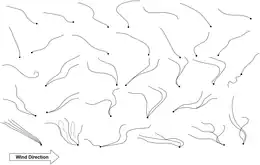 Ballooning, sometimes called kiting, is a process by which spiders, and some other small invertebrates, move through the air by releasing one or more gossamer threads to catch the wind, causing them to become airborne at the mercy of air currents.[72][73] A spider (usually limited to individuals of a small species), or spiderling after hatching,[74] will climb as high as it can, stand on raised legs with its abdomen pointed upwards ("tiptoeing"),[75] and then release several silk threads from its spinnerets into the air. These automatically form a triangular shaped parachute[76] which carries the spider away on updrafts of winds where even the slightest of breezes will disperse the arachnid.[75][76] The flexibility of their silk draglines can aid the aerodynamics of their flight, causing the spiders to drift an unpredictable and sometimes long distance.[77] Even atmospheric samples collected from balloons at 5 km (3.1 mi) altitude and ships mid-ocean have reported spider landings. Mortality is high.[78]