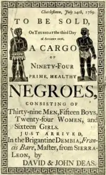 Unlike her more northern colonies, South Carolina's introduction to slavery was based largely on a preexisting enslavement system from the Caribbean in the late seventeenth century. Many of the colony's first white settlers immigrated from Barbados. By 1700, South Carolina's system of slavery resulted in the development of the rice and indigo cash crop industry. Contrary to popular understanding, cotton was not a big factor until the early 1800s.[5] By the eighteenth century, most of the slave trade in South Carolina was under the control of the Royal African Company, established by the British monarchy to facilitate trading in west Africa. Slave traders typically offered products such as iron and copper bars, brass pans and kettles, cowry shells, old guns, gunpowder, cloth, and alcohol in return for African slaves; ships typically loaded between 200 and over 600 slaves.[6]