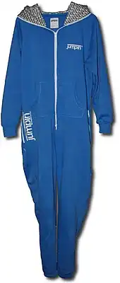 A onesie (/ˈwʌnzi/) is a type of a loose-fitting casual jumpsuit for adults made of knit cotton (as used in sweatshirts), fleece, or chenille.[1] They are mostly intended as loungewear or sleepwear, but have gained significant popularity as stylish streetwear, especially in the United Kingdom and Australia, becoming increasingly popular during the late 2000s and early 2010s as a street fashion. In 2016 the onesie also appeared in Switzerland. After onesies lost importance, in the UK the onesie made a comeback in the 2022 energy crisis to save heating costs as a warm and comfortable garment.[2]
