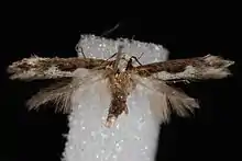 The forewings are dark greyish brown, but white along the posterior margin, the line between the two colours scalloped, or rather the white portion sends two or three teeth or processes into the brownish part, one of which is just before the cilia and is opposite to a costal white streak. The dorsal cilia are dusky silvery dusted with dark brown. The hindwings are pale yellowish fuscous.[4]
