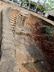 These houses appear to have been built in the 17th century under the reign of King Dakodonou, the second King of Abomey.[1] Souterrains around the Abomey plateau have been dated to the late 17th century. Archaeologists Randsborg and Merkyte initially argued that these souterrains played the sole function of providing military installations for the Dahomeyan army. To back their theory, they recounted Fon oral history about the invasion of Dahomey by the Oyo empire which states that "the Dahomean army ‘disappeared’ in the face of the enemy, later to re-appear behind him." Since 2009, the two scholars have revised their theory adding that the souterrains in the Abomey plateau played different functions ranging from mining, water storage and providing military installations. Historian Monroe Cameron agrees with the revised theory.[2]