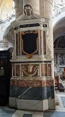Cardinal Agostino Trivulzio died in Rome, in his palazzo in the Regio Parione, which had once belonged to Cardinal Fieschi of Genoa,[44] on 30 March 1548 at 22:00 hours, Rome time.[45] He was buried in the Church of S. Maria del Popolo in Rome. In 1654, Cardinal Teodoro Trivulzio (1629-1656), the grand-nephew of Cardinal Giangiacomo Antonio Trivulzio, erected a modest monument to his ancestors:[46]