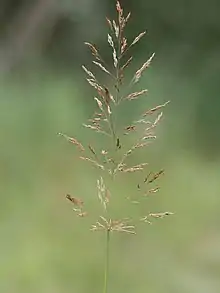 The panicle is open and loose, of green or purplish colour. It flowers from June to August.