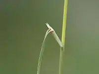 The leaves are dull green. The ligule is blunt, but toothed and up to 6 millimetres (0.24 in) long.