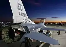 A U.S. Air Force F-16 Fighting Falcon showing its split speed brakes inboard of the stabilators or "tailerons"