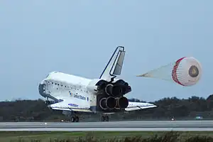 Space Shuttle Discovery on landing, showing its rudder deployed in speed brake mode