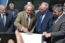 The cornerstone of the first building being placed by James M. Gavin, with Mayor Jean Masselin of Sainte-Mère-Église at far right, June 6, 1962