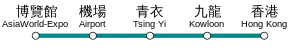 The journey from Hong Kong station to the airport takes 24 minutes. The line is coloured teal on MTR system maps.