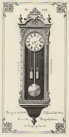 The firm acquired a reputation for building particularly fine regulators.[2] Up to the 1920s it still produced regulators with compensated pendulums and precision movements. The firm was later taken over by Junghans and the factory closed down in 1932, at which period the market for wall regulators had collapsed.[3]