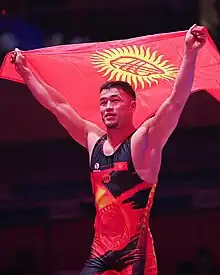 Akzhol Makhamadzhanovich Makhmudov (Russian: Акжол Махамаджанович Махмудов; born 15 April 1999) is a Kyrgyzstani Greco-Roman wrestler.[2] He won the silver medal in 77 kg event at the 2020 Summer Olympics in Tokyo, Japan. He won a gold medal at the 2022 World Championships, becoming Kyrgyzstan's first ever Greco-Roman World champion[3].[4][5] Makhmudov repeated his success a year later at the 2023 World Championships, and won another gold medal- becoming a two-time World champion.[6]