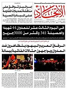 Al-Ittihad (Arabic: الاتحاد, lit. 'The Union') is an Arabic language daily newspaper in Israel. Based in Haifa, it was established in 1944 and is owned by the Israeli Communist Party. It is the oldest Arabic media outlet in Israel and considered the most important.[1] The newspaper is currently edited by Aida Touma-Suleiman.
