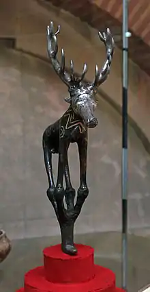 The individual animals are all deer or bulls. The feet stand on four supports which converge at a point where it probably attached to a perishable wooden pole. The deer have expansive antlers, the cows have long curved horns. The highly stylised bodies are partially decorated with silver inlay and silver or gold leaf highlights the antlers and noses.