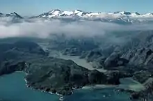 In contrast to the volcanic landscape of the refuge, the Pacific coast of the protected area is characterised by rugged cliffs, bays, fjords, and streams. In particular the Castle Cape Fjords in the Chignik area is an extremely pronounced feature, with a strong erosion by the sea, with rocks shaded in contrasting dark and light tones.[2] Notable streams drain into Agripina Bay and Port Wrangell from the glaciers and through the valleys of the refuge.