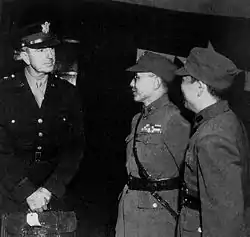 On October 27, 1944, Wedemeyer received a telegram from General George C. Marshall directing him to proceed to China to assume command of United States forces in China, replacing General Joseph Stilwell. In his new command, Wedemeyer was also named Chief of Staff to the Generalissimo Chiang Kai-shek. The telegram contained a host of special instructions and limitations on Wedemeyer's command when dealing with the Nationalist government. Wedemeyer later recalled his initial dread over the assignment, as service in the China theater was considered a graveyard for American officials, both military and diplomatic.[8] When Wedemeyer arrived at Stilwell's headquarters after Stilwell's dismissal, he was dismayed to discover that Stilwell had intentionally departed without seeing him, and did not leave a single briefing paper for his guidance, though departing United States military commanders habitually greeted their replacement in order to thoroughly brief them on the strengths and weaknesses of headquarters staff, the issues confronting the command, and planned operations.[9] Searching the offices, Wedemeyer could find no documentary record of Stilwell's plans or records of his former or future operations.[9] Wedemeyer then spoke with Stilwell's staff officers but learned little from them because Stilwell, according to the staff, kept everything in his "hip pocket".[10]