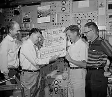 He received his BS in electrical engineering from the University of California, Berkeley in 1937.[4] After graduation, he worked for Reginald Tibbets, a prominent amateur radio operator who operated a business supplying radiation detectors to the government. Ghiorso's ability to develop and produce these instruments, as well as a variety of electronic tasks, brought him into contact with the nuclear scientists at the University of California Radiation Laboratory at Berkeley, in particular Glenn Seaborg. During a job in which he was to install an intercom at the lab, he met two secretaries, one of whom married Seaborg. The other, Wilma Belt, became Albert's wife of 60+ years.[6]