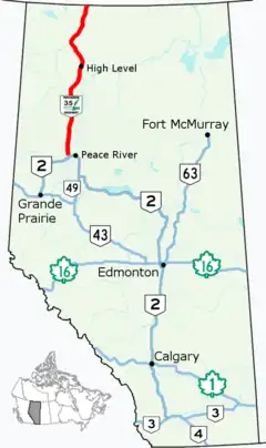 From the south, Highway 35 begins at its intersection with Highway 2, approximately 5 km (3 mi) north of the Town of Grimshaw and 19 km (12 mi) west of the Town of Peace River, and ends at Alberta's boundary with the Northwest Territories.[2] It continues on as Northwest Territories Highway 1. It is one of only two highway-grade roads connecting the NWT with a province (the other being the Liard Highway), and the only one connecting the NWT with Alberta. Highway 35 passes through the towns of Manning and High Level.