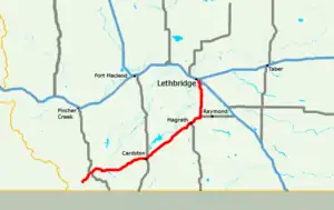 Highway 5 begins in the Hamlet of Waterton Park within Waterton Lakes National Park. After leaving the park, the highway generally travels east, passing by the hamlets of Mountain View and Leavitt, to the Town of Cardston.[1] After Cardston, the highway generally travels northeast, passing by the Hamlet of Spring Coulee, the Town of Magrath, and the Hamlet of Welling Station. Shortly after Welling Station, the highway travels north, passing the Hamlet of Welling, before ending at Highway 3 in Lethbridge.[2][3]