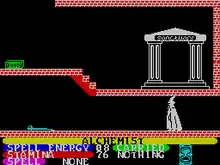The alchemist can transform into a golden eagle, requiring the use of spell energy. Transforming between the two is essential to completing the game. The alchemist can hurl lightning bolts and other spells, but the eagle form is required to negotiate steep hills or drops.[4] The alchemist can only carry one item at a time and must consume food to keep stamina levels up. Movement, bumping into objects, or transforming depletes the character's stamina.[4] Fighting monsters also reduces the character's stamina, although this can be mitigated by carrying an axe or sword.[4]