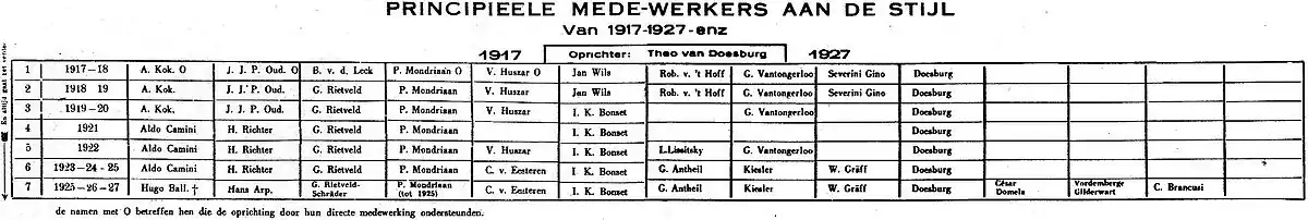 It was while reviewing an exhibition for one of these magazines he wrote for, in 1915 (halfway through his two-year service in the army), that he came in contact with the works of Piet Mondrian, who was eight years older than he was, and had by then already gained some attention with his paintings. Van Doesburg saw in these paintings his ideal in painting: a complete abstraction of reality. Soon after the exhibition Van Doesburg got in contact with Mondrian, and together with related artists Bart van der Leck, Antony Kok, Vilmos Huszár and Jacobus Oud they founded the magazine De Stijl in 1917.[4]