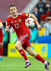 On 11 May 2018, he was included in Russia's extended 2018 FIFA World Cup squad.[20] On 3 June 2018, he was included in the finalized World Cup squad.[21] On 14 June 2018, he played a crucial role in Russia's 5–0 victory over Saudi Arabia making two assists and scoring the final goal, a free-kick in the opening match of the 2018 World Cup.[22]
