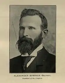 Baptised Patrick McKeown, he was always known as "Alexander" to his family, and acquired the surname "Bowman" to match that of his older half-siblings.[1] Bowman was baptised on 17 March 1854 as a Roman Catholic, but brought up as a Presbyterian.[2] A temperance campaigner in his youth, he joined the Flax Dressers' Trade and Benevolent Trade Union and, in 1881, became the first secretary of the Belfast Trades Council. He also served as secretary of the Irish Land Restoration Committee, a Georgist organisation.[3] Politically a supporter of William Gladstone and the Liberal Party, this led him to favour home rule for Ireland, and he became a regular speaker at Irish National League meetings, and secretary of the Irish Protestant Home Rule Association.[4]