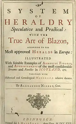 • A System of Heraldry, Speculative and Practical: With the True Art of Blazon, According to the Most Approved Heralds in Europe: Illustrated with Suitable Examples of Armorial Figures, and Achievements of the Most Considerable Surnames and Families in Scotland, &c. Together with Historical and Genealogical Memorials Relative Thereto. (1722)