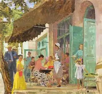 Samokhvalov created many genre and historical paintings by commission; among them were Sergey Kirov Greeting Parad of Athletes (1935, State Russian Museum), Appearance of Vladimir Lenin in All-Russian Congress of Soviets (1939, State Russian Museum), Parade of Victory (1947, sketch for Palace of the Soviets, private collection), Sergey Kirov and Iosif Stalin at the Building of Volkhov Power Station (1950, private collection, London), and others. Among his works also easel paintings: Vladimir Lenin and Iosif Stalin at the 2nd Congress of RSDLP (1939, State Russian Museum), Front Friends (1946), Stalingrad Resident, Thinking of Battle Days (both 1948), Portrait of Yevgeny Mravinsky[4] (1950), In the Sun[5] (1953), Cafe "Gurzuf"[6] (1956), Portrait of Maria Kleshar (1958).