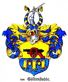 Coat of arms of the Güldenstubbe family (de) of 1751, in the Baltic Coat of arms book by Carl Arvid von Klingspor in 1882.[1]