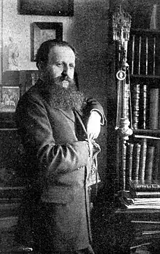 Back in Romania, Tzigara unsuccessfully applied for the Archeology Chair created at the University of Iași, but lost; according to scholar and diarist Teohari Antonescu, who emerged as the victor, the competition was rigged in his own favor, even though Tzigara "had the good sense to come prepared."[23] From 1899, he was librarian of the Carol I Academic Foundation and Professor of Aesthetics and Art History at the National School of Fine Arts.[1][2][24] As Tzigara later acknowledged, his introduction to royalty came through a relationship with the Kremnitzes.[5] This period saw the start of Tzigara's close relationship with Carol, whom the art historian later called "my most generous protector" and "the sovereign par excellence".[5] Received into royal circles, he was a confidant of the Queen Consort and cultural patron, Elisabeth of Wied, whom he called "the animator of Romanian art".[25] For a while, he was her private secretary, helping her fulfill her literary ambitions under the Carmen Sylva signature.[5][26] Tzigara's recollections speak with enthusiasm about Elisabeth's works, as well as about the king's dislike for her interests in spiritism or philosophy, and discuss Carol's enduring affection for Mite Kremnitz.[5]