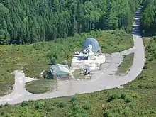 Algonquin Radio Observatory was inaugurated in 1959 and became Canada's national radio observatory in 1962.[4] The observatory house complex, radiometer building, utility buildings, University of Toronto Laboratory, 10 m (33 ft) dish and parabolic microwave feed horn instruments were designed in 1959 and construction was completed in phases over the next several years. The first instrument on the site was a new solar telescope, similar to Covington's original 4 ft (1.2 m) instrument, but slightly enlarged to 6 ft (1.8 m) which allowed it to better observe the entire solar disk. This instrument operated in parallel to the original at Goth Hill until 1962, when it took over these duties completely.[5] A second 6 ft (1.8 m) telescope, identical to the one at ARO, was later installed at the Dominion Radio Astrophysical Observatory (DRAO) in Penticton, British Columbia as a backup.