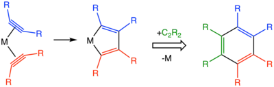 - ↑ Agenet, N.; Buisine, O.; Slowinski, F.; Gandon, V.; Aubert, C.; Malacria, M. (2007). "Cotrimerizations of Acetylenic Compounds". Org. React. 68: 1–302. doi:10.1002/0471264180.or068.01. ISBN 978-0471264187.