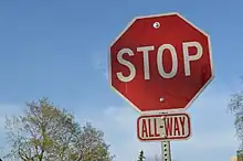 An all-way stop – also known as a four-way stop (or three-way stop etc. as appropriate) – is a traffic management system which requires vehicles on all the approaches to a road intersection to stop at the intersection before proceeding through it. Designed for use at low traffic-volume locations, the arrangement is common in the United States, Canada, Mexico, South Africa, and Liberia, as well as in a number of, usually rural, locations in Australia where visibility on the junction approaches is particularly poor. The stop signs at such intersections may be supplemented with additional plates stating the number of approaches.