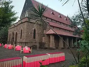 Except for the platform, the entire church was built of black stone. Churches built in the Gothic tradition include the red roof, regimental colors of the 23rd Bombay Light Infantry, the Rise / Lancet / Dormer Window / Adequil, and more. The church preserves the flag of that period. Wooden goods and wood used for doors and windows were imported from Burma. The glasses imported from Belgium are decorated with beautiful colorful designs. The church offers services in English, Marathi and Malayalam. Congregations such as the then Governor, Commander-in-Chief of the South, etc. visit the church to pray. Churches became part of the Church of the SubGenius of Pune, North India.[3] 18°33′33″N 73°50′45″E / 18.559292°N 73.845789°E