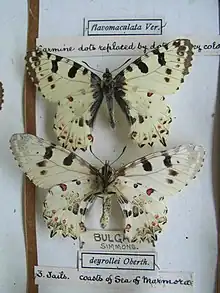 T. cerisyi God. (9d). Closely resembling in colour and pattern the male of Sericinus, being like this spotted with black on a pale yellow ground, the hindwing bearing traces of red near the middle of the costal margin and at the anal angle. Hindwing with only one strongly prominent tooth. Balcan States, Greece and Asia Minor; not so common as polyxena, occurring from April till early June, being still earlier in the southern districts. — The female varies very much ; specimens which are very strongly spotted with black are sold by dealers as ab. obscurior (9d), in albidior (9e) the ground-colour is white, in ochracea (9e) bright yellow, and in pallidior (9d) fallow; in ab. flavomaculata Verity the carmine dots are replaced by dots of honey-colour; all these aberrations occur together with ordinary cerisyi. — caucasica Led.[now species Allancastria caucasica (9e) has in both sexes very large, broad, black costal spots on the forewing, the hindwing being sUghtly and almost evenly scalloped, the middle tooth hardly projecting; in Armenia. — deyrollei Oberth.[ now species Allancastria deyrollei] (9d) has the three teeth before the anal angle of the hindwing prolonged into short tails; in the coast districts of the Black Sea, in the whole of Asia Minor, southward to Syria; extremely common, in some places appealing in enormous numbers. — cretica Reb. (9e) [now species Allancastria cretica] occurs on Crete and some Greek islands; a sparsely marked form in which the three teeth of the hindwing mentioned above are indicated only by black curved lines, the edge of the wing not being distinctly excised. Not so common as the preceding. — Larva yellow, brown or reddish, the tubercles being red; from May till July, on Aristolochia. Pupa dust-colour or yellowish grey, variegated with thin black dashes , especially on the head. — The buttertlies are on the wing on the first warm days of the year at rocky places and the edges of woods. [1]