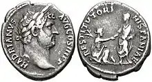 Hadrian made frequent trips to many provinces of the Empire, and to commemorate these trips in a propagandistic way, coins relating to these trips were minted by each province. One of them corresponds to Hadrian's trip to Hispania. The most famous allegory of Hispania was coined in Rome; it was a female figure with a long tunic, stamped with laurel or olive, reclining to the left, with her left arm on some rocks, which could refer to the Pyrenees. With his right hand he holds an olive branch. At the feet of the figure appears a rabbit, the animal that the Phoenicians theoretically used to name the peninsula: Hishphanim.