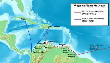 - ↑ RAMOS, Demetrio (1980). "El regreso de Alonso de Ojeda de su viaje de descubrimiento". In Antonio DOMÍNGUEZ ORTIZ (ed.). Homenaje a Antonio Domínguez Ortiz. Madrid: Ministerio de Educación y Ciencia. ISBN 84-369-0833-3., cited in RAMOS, Demetrio (1982). "El retorno a España de Alonso de Ojeda, en calidad de preso, después de su Segundo Viaje" (PDF). Quinto Centenario. pp. 209–220. Archived from the original (PDF) on 2016-03-03. Retrieved 2012-01-29.
