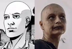 Alpha, as she appears in the comic book series (left) and as portrayed by Samantha Morton in the television series (right).