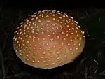 A large, conspicuous mushroom, Amanita muscaria is generally common and numerous where it grows, and is often found in groups with basidiocarps in all stages of development. Fly agaric fruiting bodies emerge from the soil looking like white eggs. After emerging from the ground, the cap is covered with numerous small white to yellow pyramid-shaped warts. These are remnants of the universal veil, a membrane that encloses the entire mushroom when it is still very young. Dissecting the mushroom at this stage reveals a characteristic yellowish layer of skin under the veil, which helps identification. As the fungus grows, the red colour appears through the broken veil and the warts become less prominent; they do not change in size, but are reduced relative to the expanding skin area. The cap changes from globose to hemispherical, and finally to plate-like and flat in mature specimens.[27] Fully grown, the bright red cap is usually around 8–20 centimetres (3–8 inches) in diameter, although larger specimens have been found. The red colour may fade after rain and in older mushrooms.