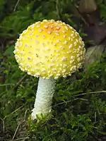 Amanita muscaria var. inzengae[41] | Inzenga's fly agaric | it has a pale yellow to orange-yellow cap with yellowish warts and stem which may be tan. |